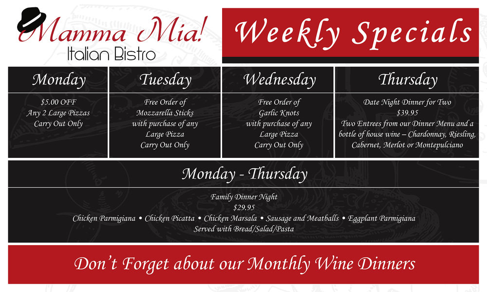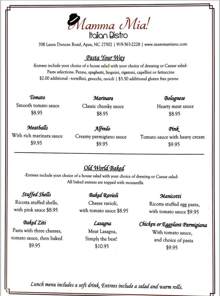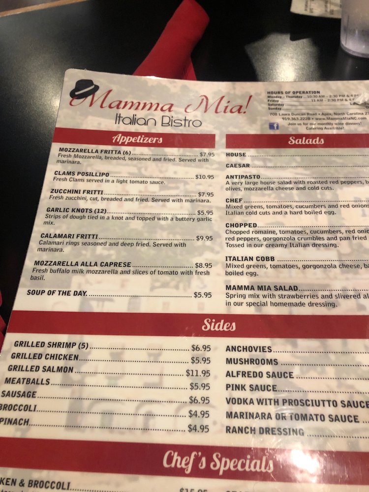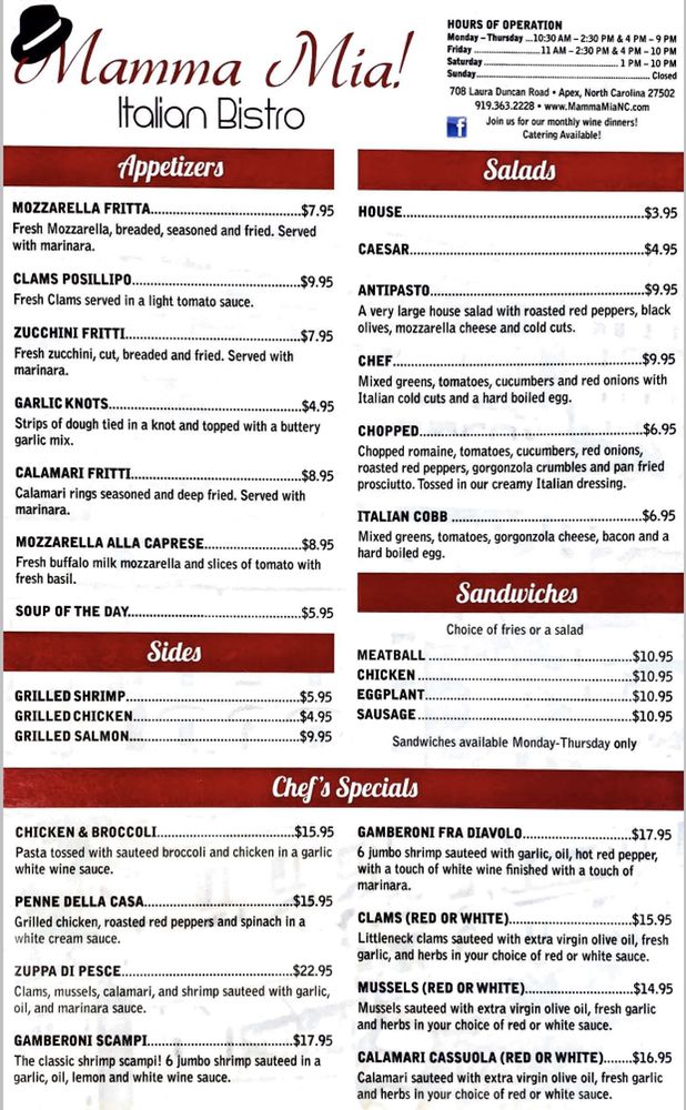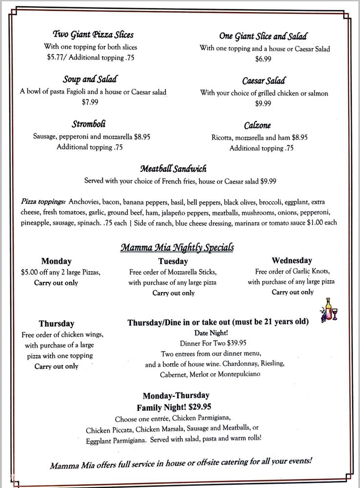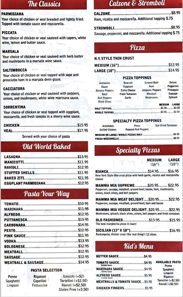 Mamma Mia Italian Bistro offers a wide range of Italian dishes in a casual setting. With options for vegan and vegetarian diets, the menu includes classic items like Chicken Parmigiana, Supreme Pizza, and Baked Ziti. Customers have praised the efficient service, delicious food, and comfortable atmosphere. The house Chianti and veal parmigiana are standouts, with portion sizes just right. While some reviewers suggest improvements like dimming the lights for a cozier ambiance, the overall experience at Mamma Mia's is highly recommended. Whether you're looking for a quick lunch or a relaxing dinner, this Italian bistro is a favorite among locals and visitors alike. With convenient amenities like delivery, takeout, and catering options, Mamma Mia Italian Bistro is a must-visit for Italian food lovers.